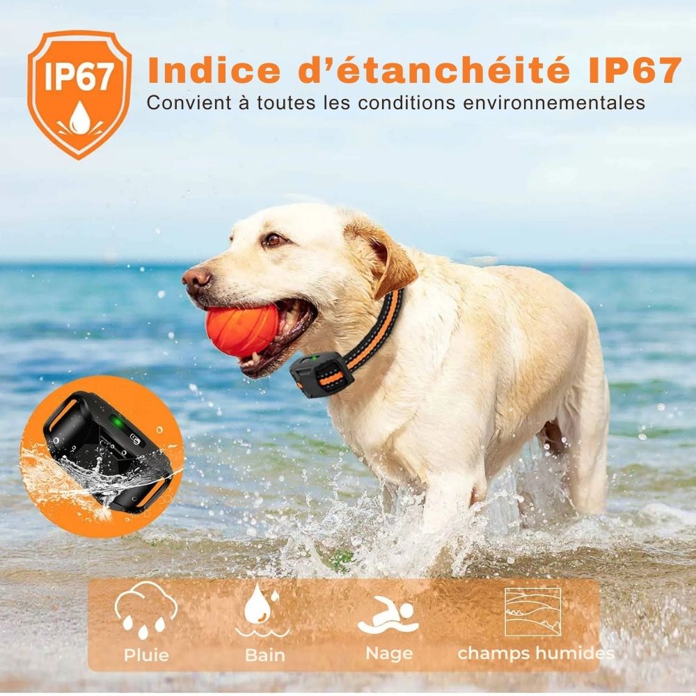 Conçu pour les chiens actifs, le collier est étanche IP67 et résiste aux éclaboussures comme aux baignades.